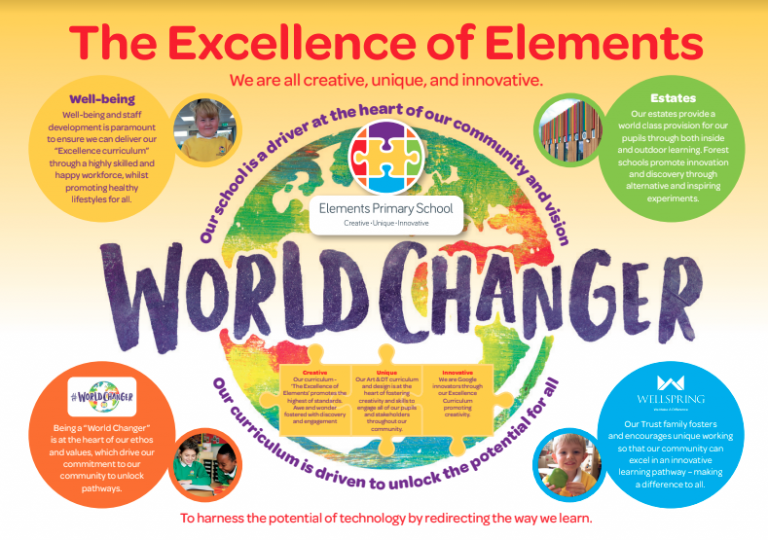 At Elements Primary School, we aim to give all the children of Elements Primary School the knowledge, skills, resilience, and ambition to become confident world changers at a local, national and global level.